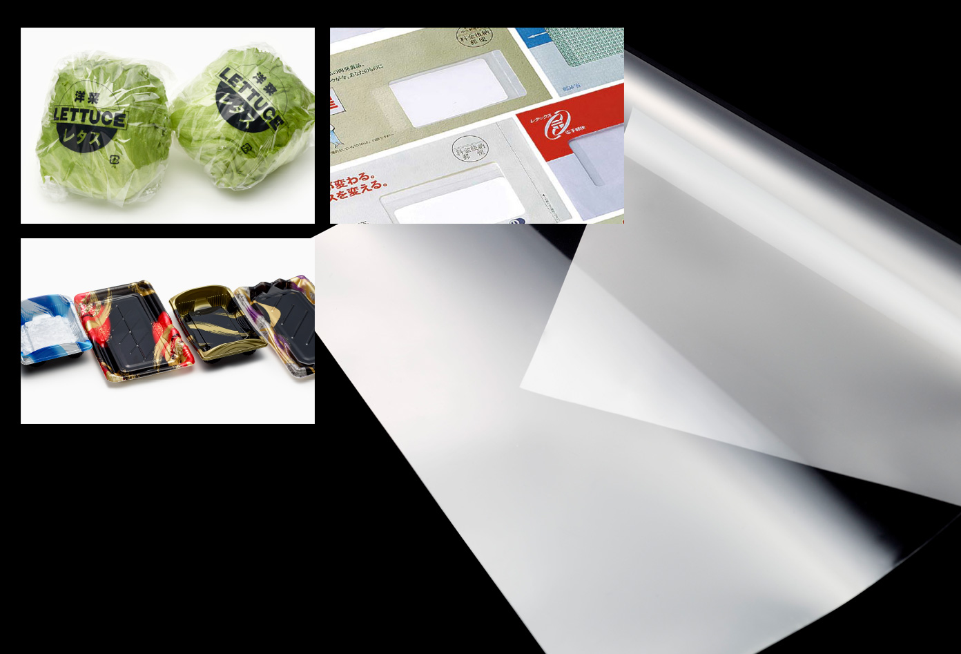 野菜などの生鮮食品向けには、包装後の輸送時や購入後の鮮度低下を抑制するのに適したフィルムを。冷凍食品・惣菜・食肉などには、それぞれの特性や包装形態に適したフィルムを。封筒の窓貼りには、透明性・光沢性、工場での作業性に優れたフィルムを。工業用途では電子製品に帯電防止、機械部品には防錆フィルムなどの扱いもあります。さまざまな用途に優れた機能特性を持ったフィルムで多くの包装ニーズにお応えします。